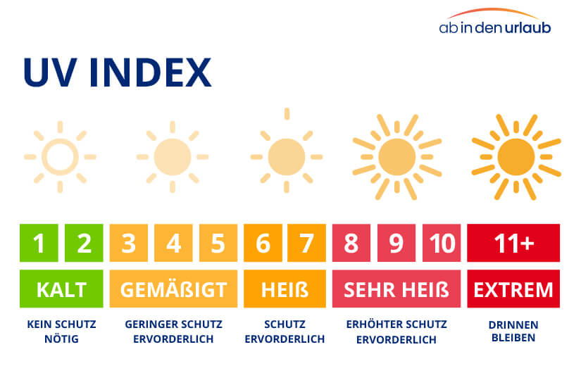 Im deutschen Sommer erreicht der UV Index durchaus Werte bis 8 auf der Skala. In vielen Urlaubsländern liegen diese zur warmen Jahreszeit sogar noch höher. Die Durchschnittswerte im heißesten Monat sehen demnach in den Urlaubsdestinationen wie folgt aus: