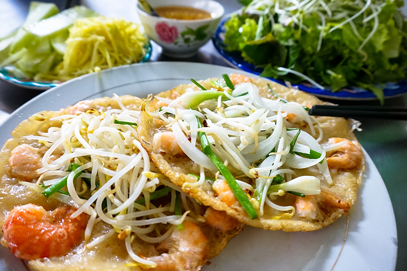 In Restaurants werdet ihr Banh Xeo vorwiegend als Vorspeise finden, auch an Street Food Ständen gibt es ihn oft. Hier habt ihr die Qual der Wahl, ob ihr ihn rein vegetarisch mit Gemüse und Bambussprossen oder fleischhaltig mit Schweine- oder Hühnchenfleisch genießen wollt. Auch eine Variante mit Garnelen oder Muscheln ist meist möglich. Zu den flachen Banh Xeo gibt es Salat, Erdnuss- oder Fischsauce zum Dippen.
