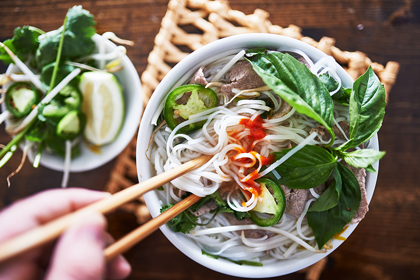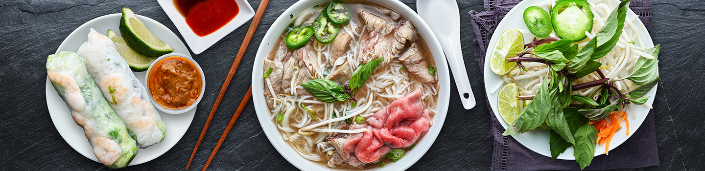 Die Hauptzutaten der Suppe sind Reisnudeln und eine Rinderbrühe, sowie eine Auflage aus dünnen Fleischscheiben. Diese können aus Rind- oder Hühnerfleisch bestehen. Ihr erhaltet zu eurer Pho zudem einen Teller mit einer Auswahl an Kräutern und Gewürzen, zum Beispiel Chili, Basilikum und Koriander. Auch Minze, Frühlingszwiebeln oder Soja können als Beilage gereicht werden. Damit dürft ihr die Suppe nach Belieben verfeinern.