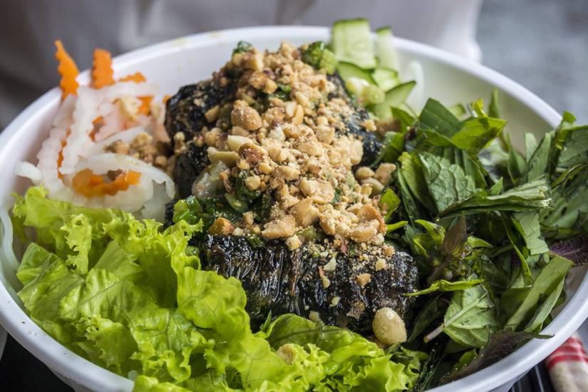 Das Gericht ist ein Salat aus Koriander, Sprossen und Bananenblüten, welcher mit einem süß-sauren Dressing aus Zucker, Fischsauce und Limettensaft verfeinert wird. Als Topping könnt ihr noch etwas gebratenes Fleisch dazu bestellen.