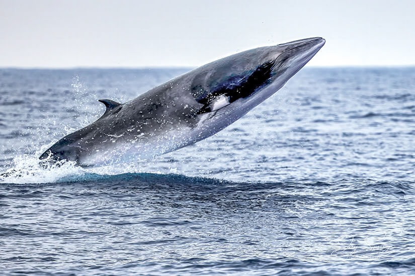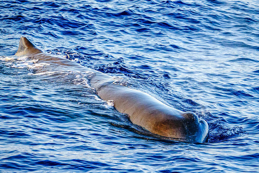 Es gibt einige Arten, die zwar im Mittelmeer leben, aber seltener vorkommen. Dazu gehört der Zwergwal, der zu den Bartenwalen zählt und zwischen 6,8 und 9,8 Metern lang wird. Der Körper ist stromlinienförmig und schlank. Die sichelförmige Finne sitzt sehr hoch. Ein heller Bauch ist mit einem dunkelgrau-braunen Rücken vereint, der bei einigen Tieren fast schwarz erscheint. In der Regel leben Zwergwale einzeln oder in kleinen Gruppen von zwei bis drei Tieren. Beim Auftauchen werdet ihr bemerken, dass Zwergwale zunächst nur mit ihrem Kopf und dann mit dem Blas an der Wasseroberfläche erscheinen. Nach dem Verschwinden des Blas werdet ihr die Finne erkennen können. Die Art zählt zu den nicht gefährdeten Walen.