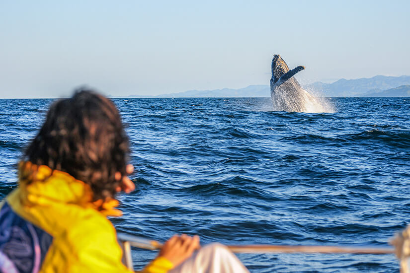 Wenn ihr die richtigen Orte kennt, könnt ihr auch vom Land Wale beobachten. Oft ist eine kleine Wanderung zum perfekten Aussichtspunkt notwendig. Nehmt euch ausreichend Proviant mit und denkt daran, ein Fernglas und eine Kamera einzupacken. Je nach Saison ist wetterfeste Kleidung hilfreich. Das Wichtigste: Ihr braucht Geduld. Wale zeigen sich manchmal erst nach mehreren Stunden. Deshalb kann es sinnvoll sein, sich vor Ort einen Guide zu suchen, mit dem ihr zur richtigen Zeit am richtigen Ort seid.