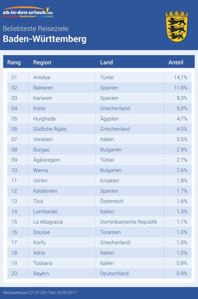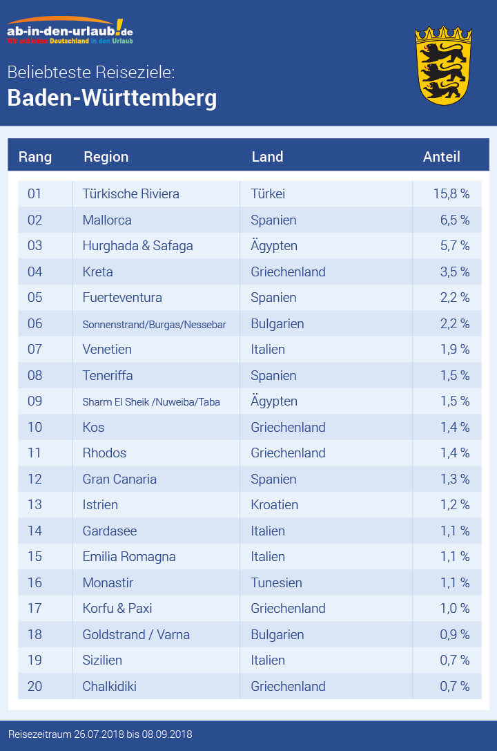 Wo verbringen unsere Kunden in Baden-Württemberger dieses Jahr ihren Sommerurlaub? Wir haben alle Buchungen ab einer Reisedauer von sieben Tagen für den Ferienzeitraum ausgewertet.