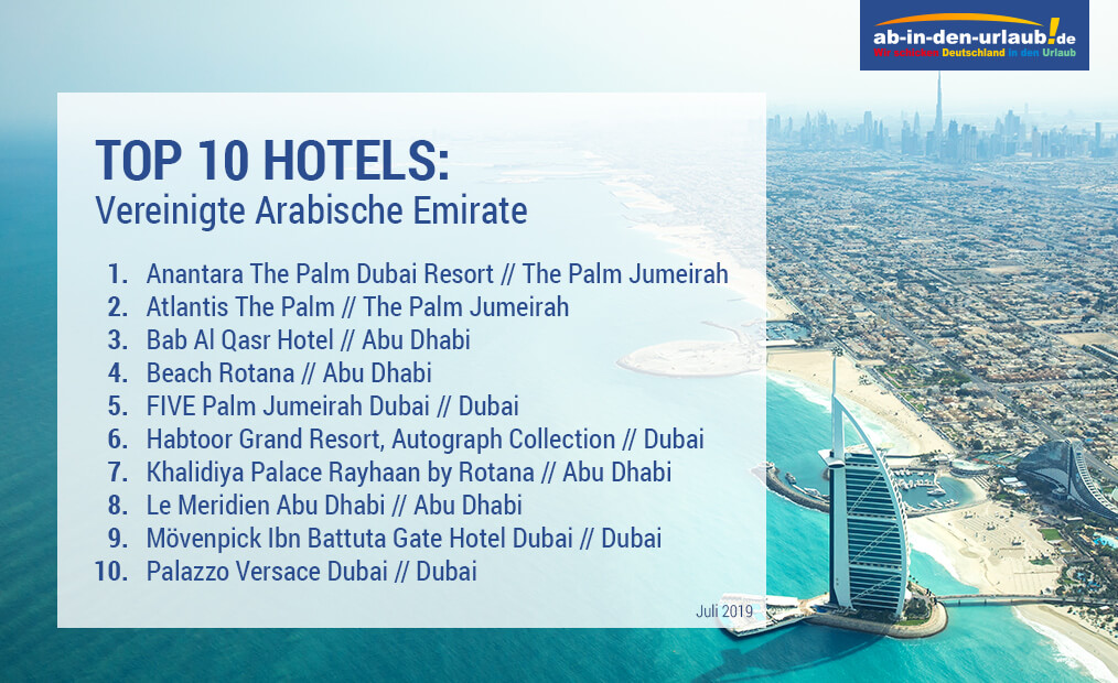 Schillernde Glasbauten in einem Meer aus Sand, pulsierender Luxus und menschenleere Sanddünen, zeitgenössische Moderne und morgenländische Kultur - die Emirate stehen im Zeichen der Gegensätze. Welche Hotels sind vor Ort bei unseren Kunden am beliebtesten? Zeitraum: Juli 2019.