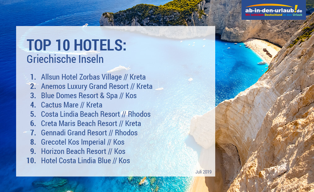 Kreta, Kos und Rhodos - diese Inseln versprechen weiße Sandstrände, tiefblaues Meer und romantische Antikstädte. Griechenlands Sonneninseln sind ein wahrer Touristenmagnet. Wir haben ausgewertet, welche Hotels am beliebtesten sind. Zeitraum: Juli 2019.