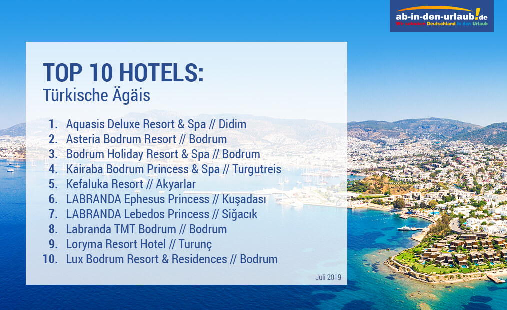 An den alten Mauern Trojas entlang spazieren, die antiken Ruinen von Ephesos besichtigen und die Kalksteinterrassen Pamukkale bestaunen - die Türkische Ägäis hat mehr zu bieten als Sonne, Strand und Meer. Wir wollten wissen, welche Hotels bei unseren Kunden am beliebtesten sind. Zeitraum: Juli 2019.