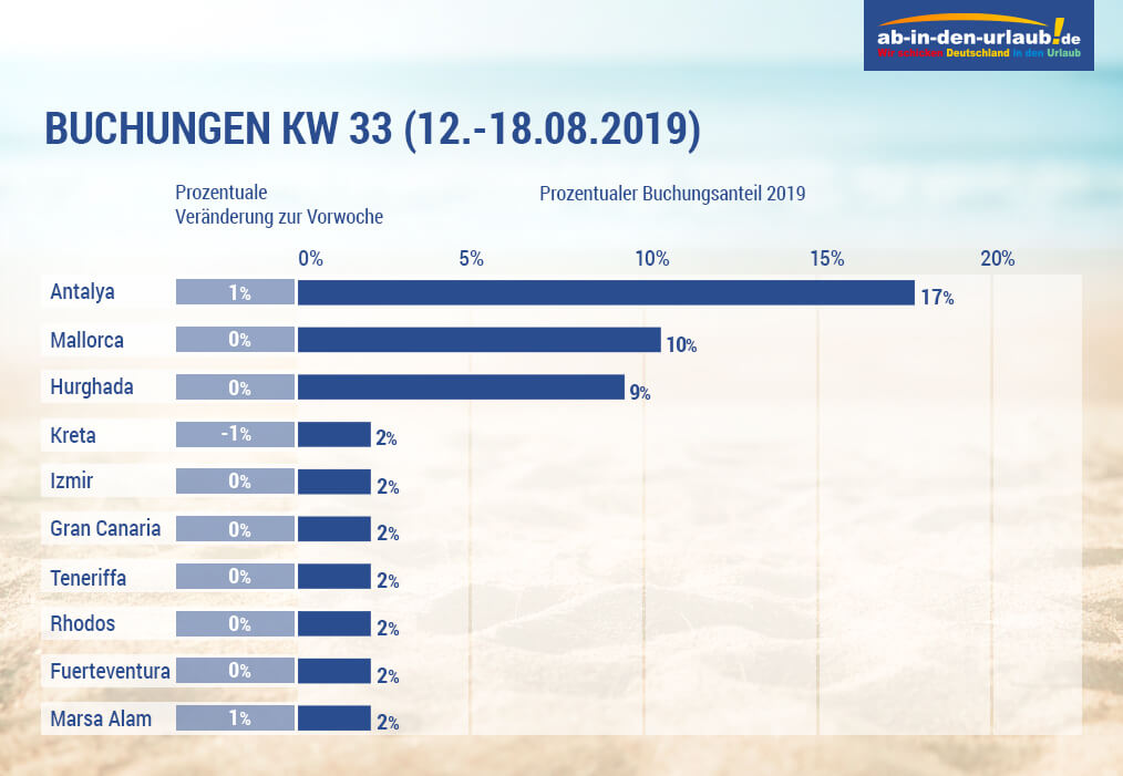 Die Top 4 bleiben im Vergleich zur Kalenderwoche 32 gleich, auch wenn Antalya seinen Buchungsanteil leicht erhöhen kann, während Kreta einen Prozentpunkt verliert.