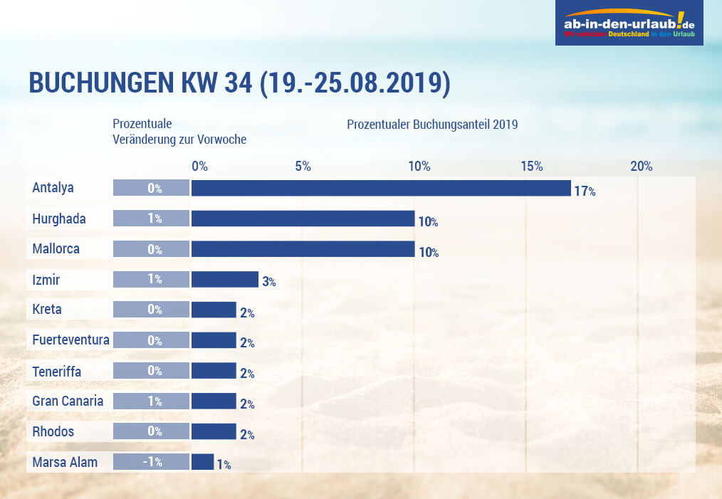 Der Buchungsanteil für Antalya und Kreta geht um einen Prozentpunkt zurück, dafür gewinnen Hurghada und Mallorca jeweils ein Prozent im Vorwochenvergleich.