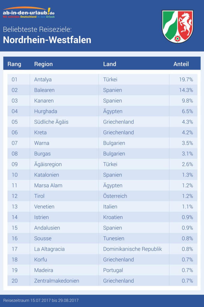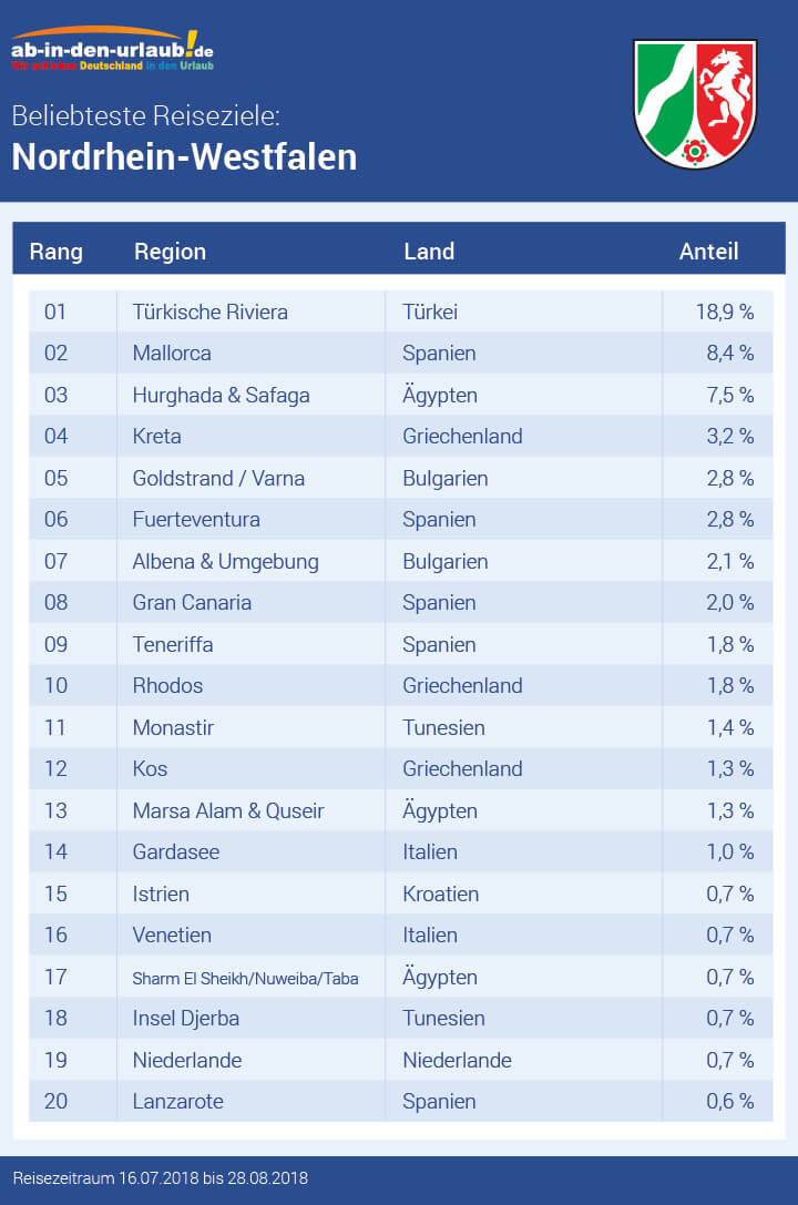 Wo verbringen unsere Kunden in Nordrhein-Westfalen in diesem Jahr ihren Sommerurlaub? Wir haben alle Buchungen ab einer Reisedauer von fünf Tagen für den Ferienzeitraum ausgewertet.