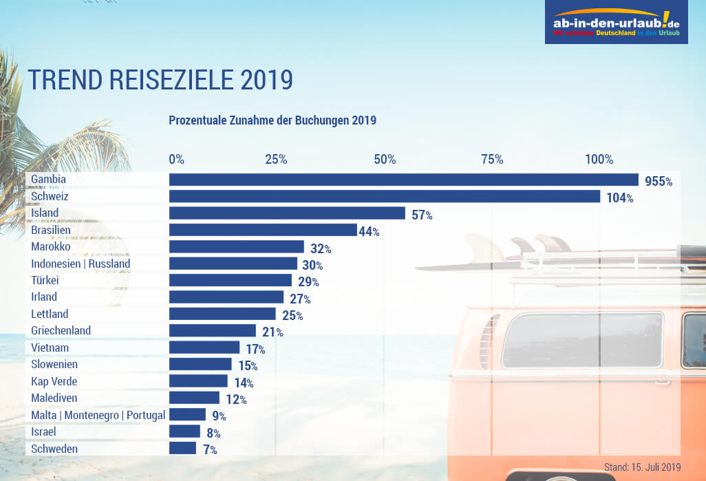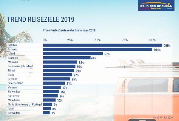 Welche Reiseziele haben 2019 im Vorjahresvergleich den größten prozentualen Zuwachs an Buchungen und liegen damit voll im Trend? Eine Auswertung von ab-in-den-urlaub.de zeigt: Es sind Gambia, die Schweiz und Island! Stichtag: 15. Juli 2019.