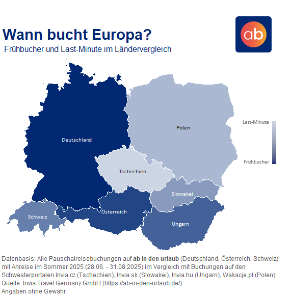 ¹Datenbasis: Alle Pauschalreisebuchungen auf ab in den urlaub (Deutschland, Österreich, Schweiz) mit Anreise im Sommer 2025 (28.06. - 31.08.2025) im Vergleich mit Buchungen auf den Schwesterportalen Invia.cz (Tschechien), Invia.sk (Slowakei), Invia.hu (Ungarn), Wakacje.pl (Polen).
